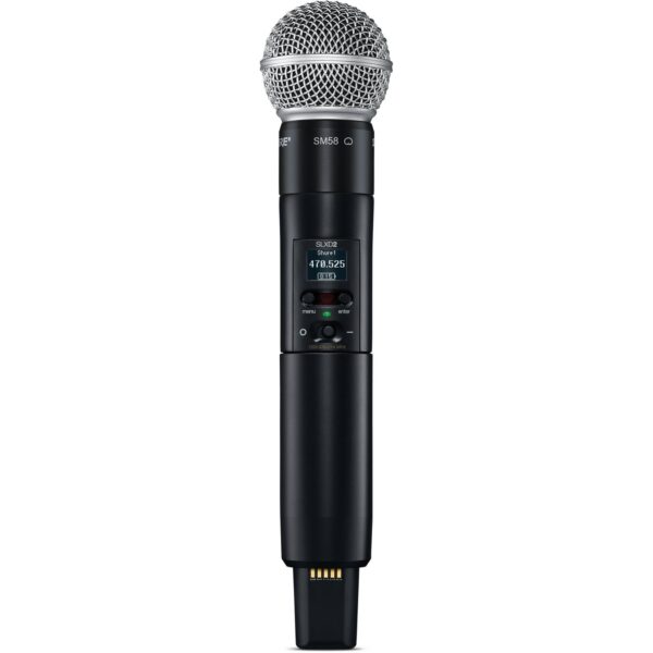 El Shure SLXD24/SM58-H55 es un sistema de micrófono inalámbrico digital profesional diseñado para presentaciones en vivo, eventos, iglesias, conferencias y producciones audiovisuales. Integra un transmisor de mano con cápsula SM58, reconocido mundialmente por su claridad vocal y resistencia, junto con un receptor SLXD4 de alto rendimiento.