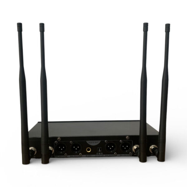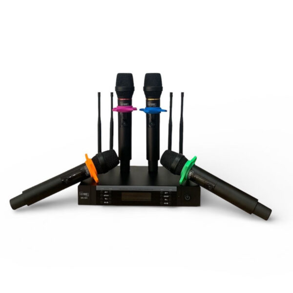 Ideal para: Iglesias, reuniones, presentaciones, bandas en vivo, conferencias, teatro y producciones audiovisuales que necesitan cuatro micrófonos inalámbricos con sonido claro, alcance confiable y operación sin complicaciones.